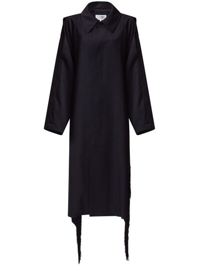 black wool concealed front button fastening classic collar belted waist fringe detailing long sleeves signature single-stitch logo straight hem
