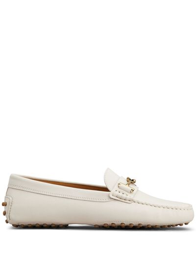 white calf leather almond toe moc stitching decorative buckle detail studded sole rubber sole logo at the sole slip-on style
