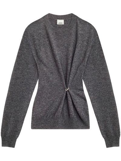 dark grey merino wool blend fine knit ruched detailing crew neck ribbed cuffs and hem