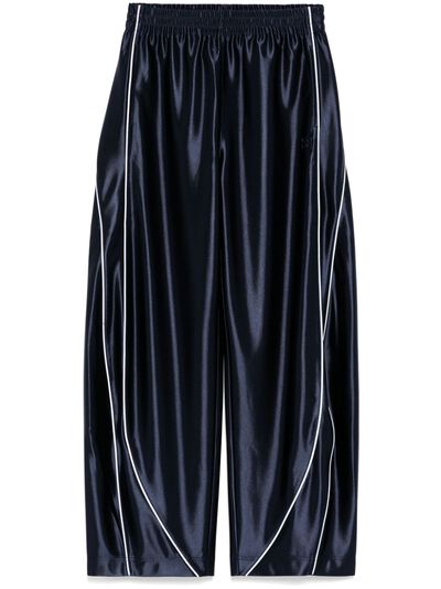 navy blue elasticated waistband with internal drawstring two side inset pockets piped-trim detailing straight hem