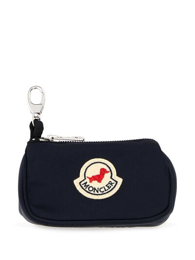 midnight blue satin weave appliqué logo top zip fastening carabiner attachment silver-tone hardware