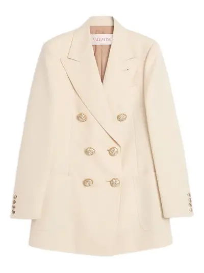 light beige virgin wool crystal-embellished buttons double-breasted button fastening peak lapels two side patch pockets long sleeves buttoned-cuff sleeves straight hem