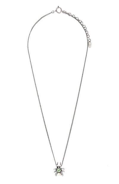 Подвеску в виде паука с жемчужной бусиной в лапках декорировали цветными кристаллами. Аксессуар из латуни с палладиевым покрытием дополнен тонкой регулируемой цепочкой с брендированной пластиной на конце.