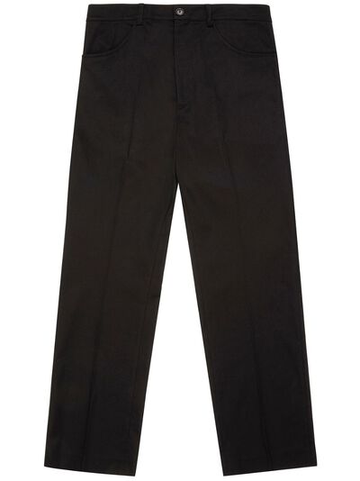 black stretch-cotton pressed crease belt loops front button and zip fastening two side inset pockets straight leg