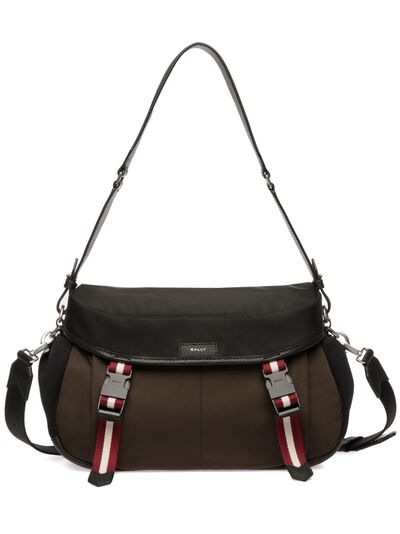 green logo stamp to the front leather trim foldover top adjustable shoulder strap buckle fastening main compartment internal logo stamp