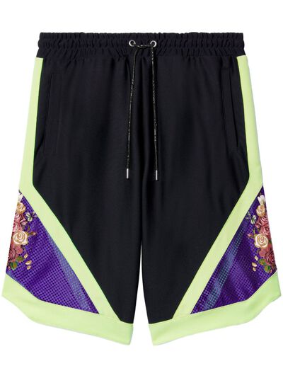 black elasticated drawstring waistband floral print mesh panelling curved hem
