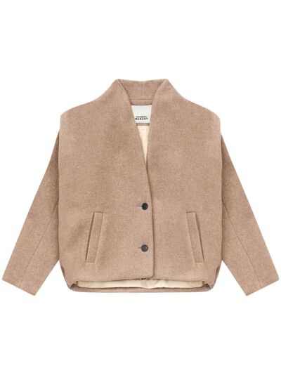 taupe brown wool blend front button fastening long sleeves two side slit pockets straight hem internal logo patch