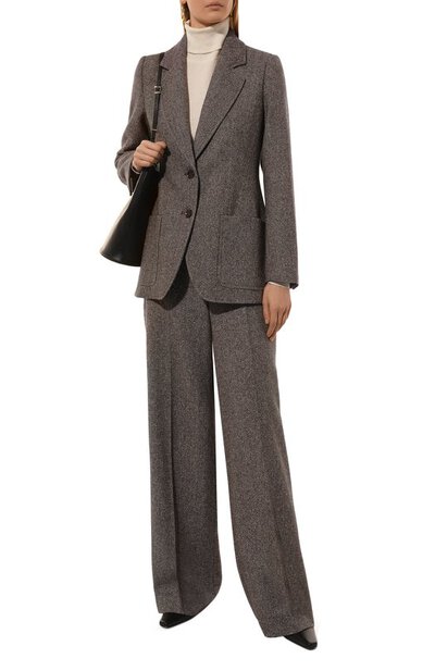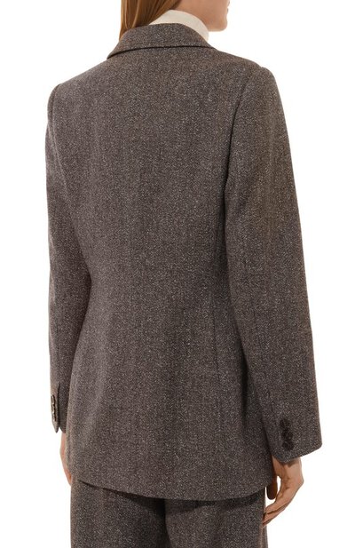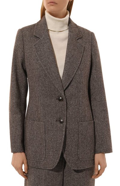 Однобортный пиджак Nord с широкими лацканами и двумя накладными карманами выполнен из шерсти, укрепленной нитями полиэстера. Приталенная модель с шевронным узором дополнена вискозным подкладом.