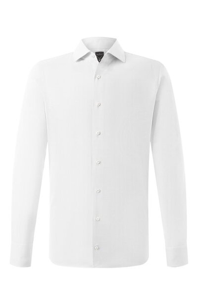 Белоснежная сорочка кроя slim fit будет уместна в офисе со строгим дресс-кодом. Модель со сшивной кокеткой и воротником «акула» выполнили из хлопка добби с характерной зернистой фактурой. Само изделие, как и закругленные манжеты, застегивается пуговицами из перламутра.