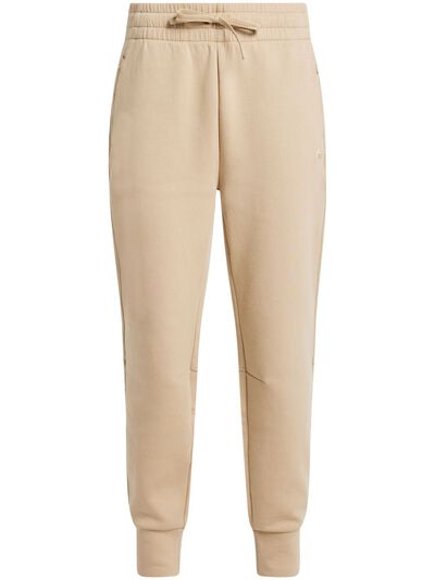 beige organic cotton appliqué logo elasticated drawstring waistband slip pockets to the sides straight leg elasticated ankles