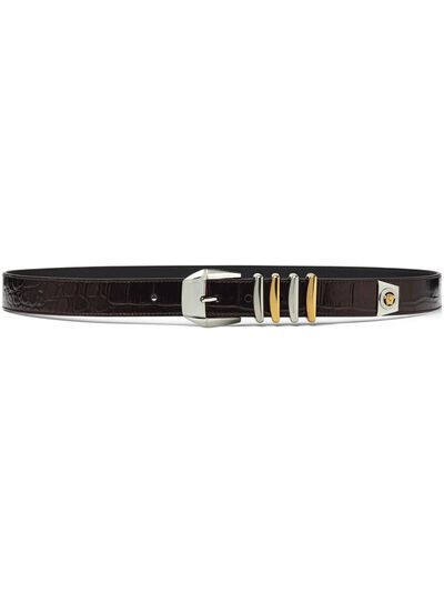 dark red leather embossed crocodile effect buckle fastening two-tone hardware punched holes Medusa Head motif adjustable fit