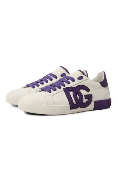Белый цвет кедов Portofino Vintage Доменико Дольче и Стефано Габбана сделали фоном для деталей контрастного фиолетового оттенка. В нем выполнили шнуровку, брендированную вставку на подошве, нашивку сзади и крупную аппликацию в форме монограммы DG. Для пошива обуви выбрали матовую телячью замшу.