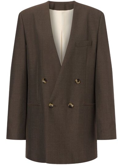 brown wool blend no lapels double-breasted button fastening V-neck chest welt pocket two front welt pockets long sleeves straight hem
