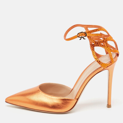 Deliver statement looks with these metallic orange sandals from Gianvito Rossi From their shape and detailing to their overall appeal, they exude elegance. The sandals feature pointed toes, embellished counter straps, and stiletto heels.