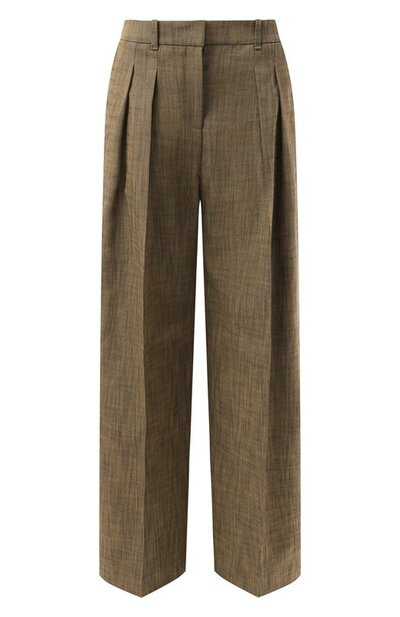 Прямые брюки выполнили из меланжевой ткани sharkskin на основе вискозы. Спереди под шлевками заложили двойные складки, а по бокам предусмотрели карманы. Над правым задним карманом расположили логотип.