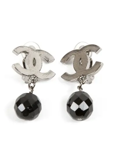 circa 2010 black dangle design signature interlocking CC logo bead detailing clip-on design These earrings come as a pair. Condition: GOOD. This previously owned and used item is in good condition with minimal signs of use. This may include fading of material or plating and scratches.