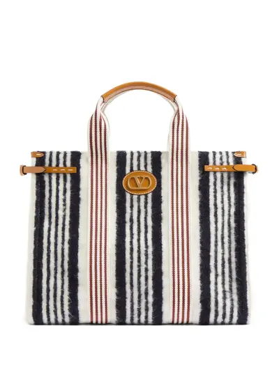 white cotton-linen blend vertical stripes pattern concealed magnetic fastening two top handles VLogo Signature leather trims main compartment internal zip-fastening pocket