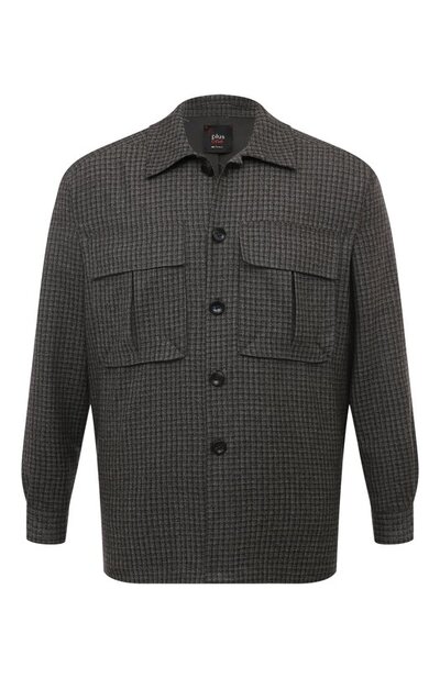 Серую рубашку в небольшую клетку выполнили из плотной мягкой шерсти с шелковистыми волокнами. Приятный на ощупь материал удерживает тепло, обеспечивая комфортный микроклимат в прохладный день. Роль декора на себя взяли крупные нагрудные карманы с широкими клапанами. Нам нравится сочетать такую модель с белой футболкой и темно-синими брюками.