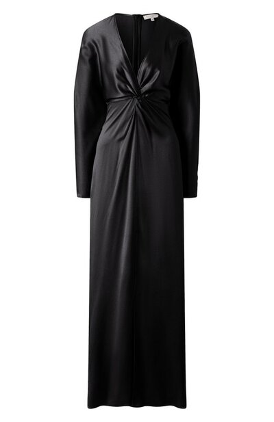 Длинное платье с потайной молнией на спинке сшили из атласа, сочетающего шелк и ацетат. Модель с рукавом «доломан» и объемным узлом в основании V-образного декольте дополнили высоким разрезом спереди.