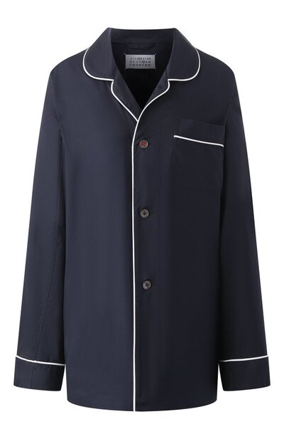 Рубашку со спущенной линией плеч сшили из шелкового поплина. Воротник, манжеты и нагрудный карман подчеркнули контрастным кантом. Спинку украсили четырьмя фирменными стежками, которым вторит строчка в виде литеры M на верхней пуговице.