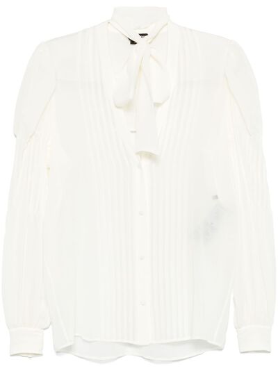 light beige front button fastening attached scarf pintuck detailing long puff sleeves