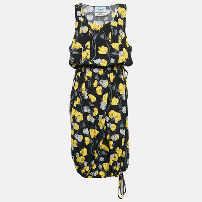 Prada Black Floral Print Silk Sleeveless Adjustable Waist Midi Dress M 1092051 - 1 small