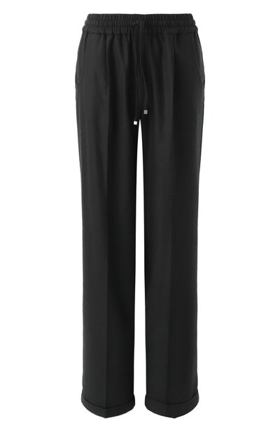 Широкие брюки с проглаженными стрелками дополнили поясом-кулиской, регулируемым шнурком с эглетами. Модель с отворотами и четырьмя карманами сшили из стрейчевой шерсти, усиленной полиэстером.