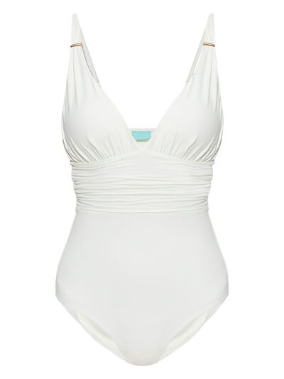 white adjustable shoulder straps plunging V-neck ring embellishment Be mindful to try on swimwear over your own garments.