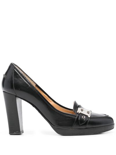 circa 2000s black calf leather smooth grain block heel buckle-strap fastening almond toe branded leather insole leather sole Condition: GOOD. This previously owned and used item is in good condition with minimal signs of use. This may include fading of material or plating and scratches.