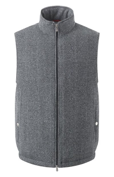 Жилет на гусином пуху сшили из чесаной ткани с шевронным узором, сотканной из шерсти и кашемира. Модель с высоким воротом и встречной молнией дополнили двумя внешними и внутренними карманами и держателем для ручки.
