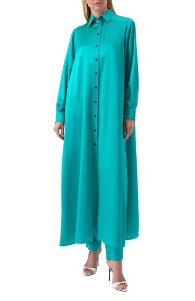 Длинное платье-рубашку на контрастных пуговицах выполнили из шелкового атласа. Сзади у модели заложили бантовую складку, а по бокам на подоле предусмотрели высокие разрезы.