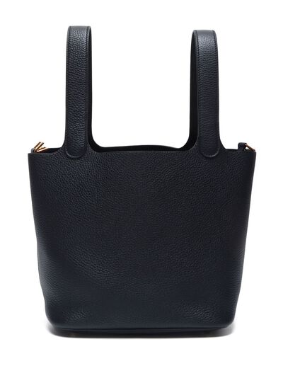 circa 2023 black calf leather two top handles strap fastening internal logo stamp gold-tone hardware Condition: GOOD. This previously owned and used item is in good condition with minimal signs of use. This may include fading of material or plating and scratches.