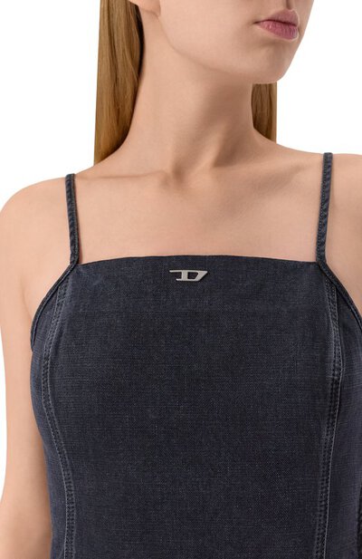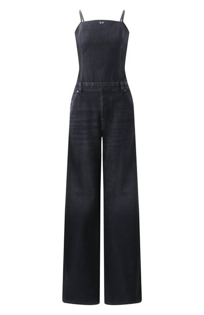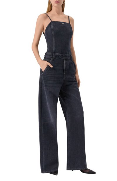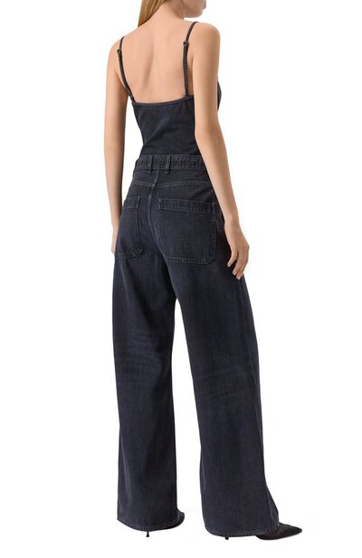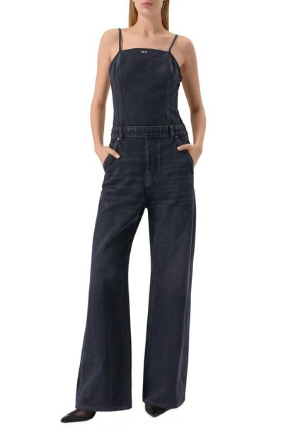 Комбинезон с узкими регулируемыми бретелями сшили из денима с добавлением модала. Модель, напоминающую комплект из топа и джинсов с пятью карманами, украсили искусственными заломами на широких брючинах и серебристой эмблемой на лифе спереди.