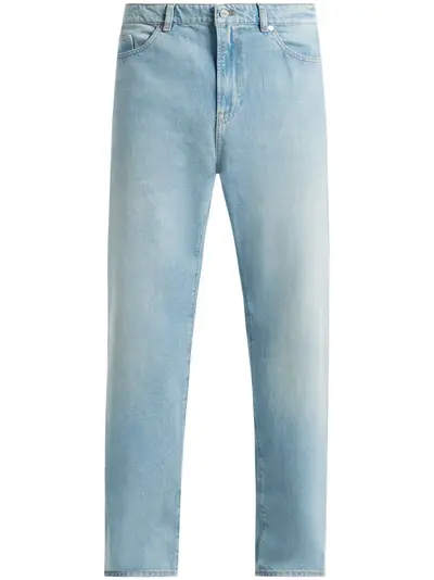 blue organic cotton washed denim classic five pockets front button and zip fastening mid-rise belt loops logo patch to the rear straight leg
