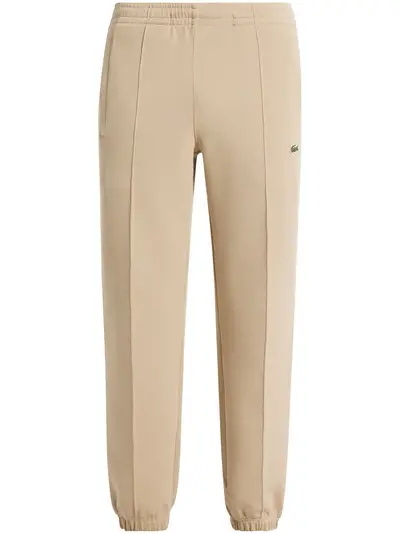 beige organic cotton piqué weave appliqué logo two side slash pockets rear welt pocket elasticated waistband tapered leg elasticated cuffs