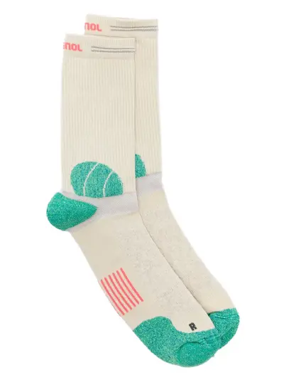 light beige jacquard logo motif contrasting border Be sure before opening, as socks and hosiery can only be returned in their original, unopened packaging.