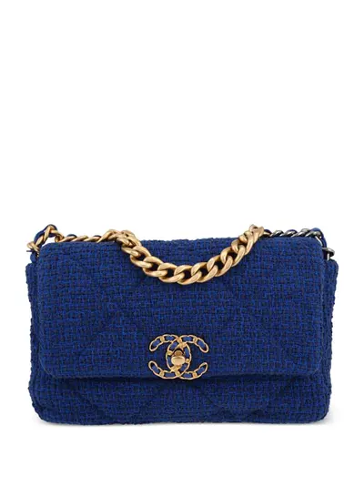 circa 2021 royal blue canvas/leather tweed diamond quilting signature interlocking CC turn-lock fastening foldover top leather and chain-link shoulder strap signature gourmette-chain top handle main compartment slip pocket to the rear gold-tone hardware This item comes with an original Chanel authenticity card. This piece comes complete with a protective dust bag.