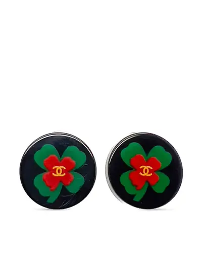 circa 2004s black/multicolour silver plated clover print signature interlocking CC logo clip-on buckle fastening These earrings come as a pair. Condition: GOOD. This previously owned and used item is in good condition with minimal signs of use. This may include fading of material or plating and scratches.