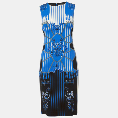 Elevate your casual wardrobe with this exquisite blue sleeveless dress from Versace. Crafted with luxurious crepe, it drapes effortlessly, showcasing a stunning chain print that exudes sophistication. The carefully blended viscose and elastane offer a soft yet stretchy fit, while a discreet zip closure perfects the silhouette. Ideal for fashion forward women, this dress merges everyday comfort with designer glamour, making it a must have for those who appreciate fine craftsmanship and style.