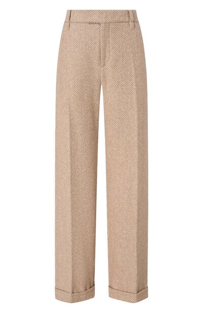Широкие брюки Loose Flared с высокой посадкой и отворотами, визуально удлиняющие ноги, станут основой элегантного образа. Модель сшили из мягкого прочного твида с коричневым шевронным узором, сотканного из тонкой легкой шерсти овцы и альпака на мануфактуре марки в Соломео. Заднюю шлевку украсили фирменной цепочкой мониль.