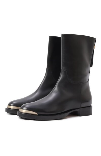 Полусапоги на протекторной подошве и небольшом каблуке выполнили из гладкой кожи. Мыс укрепили пластиной, в тон которой сделали брендированную деталь на петле голенища. Пара застегивается сбоку молнией.