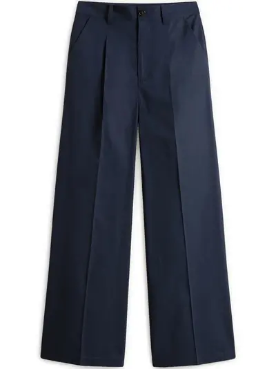 prussian blue concealed fly and button fastening two side slash pockets rear welt pocket pleat detailing