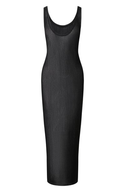 Платье с широкими бретелями и глубоким декольте сшили из полупрозрачного стрейчевого трикотажа на основе вискозы. Облегающая модель гармонично подойдет для отдыха в прибрежном кафе.