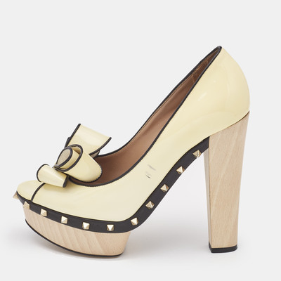 Valentino Cream/Black Patent Leather Wooden Platform Rockstud Pumps Size 39 1106381 - 1