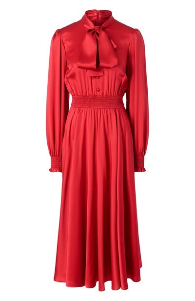 В коллекцию Everyday вошло атласное платье с воротником аскот и планкой с обтянутыми тканью пуговицами. Модель с эластичными гофрированными поясом и манжетами застегивается молнией сзади.