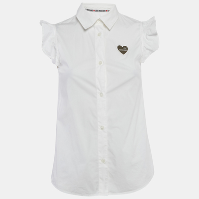Elevate your casual wardrobe with this exquisitely crafted Love Moschino creation, a charming white cap sleeve blouse that speaks of timeless elegance. Made from premium cotton, it offers a breathable feel, perfect for warm days. The stylish button front adds a touch of sophistication, making it versatile for any casual setting. Its sleek design is ideal for fashion forward women seeking a blend of comfort and chic class in their everyday attire.