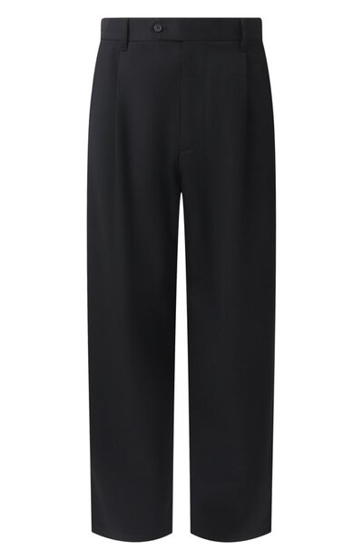Брюки со складками спереди сшили из полиэстерового твила с добавлением хлопка. Модель дополнили боковыми карманами и прорезными задними с пуговицами.
