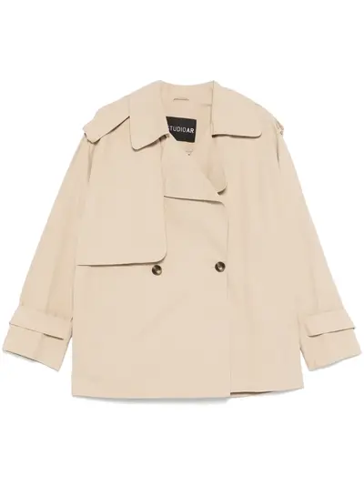 almond beige double-breasted button fastening two side welt pockets belted cuffs inverted pleat