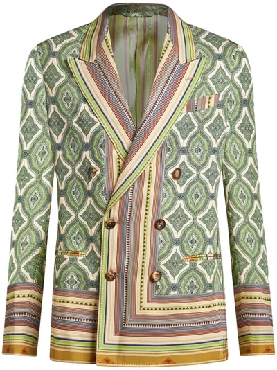 light green/multicolour double-breasted button fastening geometric-pattern print peak lapels long sleeves buttoned cuffs chest welt pocket two front jetted pockets stripe trim striped lining straight hem