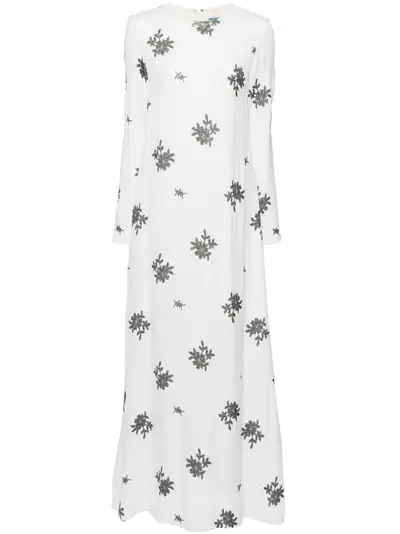 black/white sequin design concealed rear hook and zip fastening floral motif round neck long sleeves cuff zips two side inset pockets side slit floor-length full lining